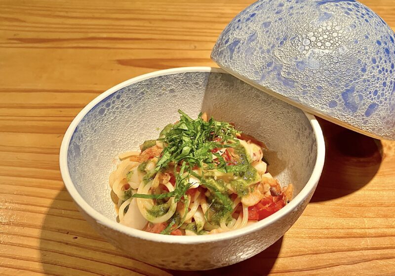 続いて蓋付きの球形の器で出てきたのは、桜海老とイカ、フレッシュな若松トマトを、鰹節と昆布、ハマグリをベースにしたソースで和えたパスタ。これがまた独創的で、ここまでくるともう洋風とか和風とかいう概念はなくなり、現代料理における"フュージョン"(融合)という意味も理解できる。