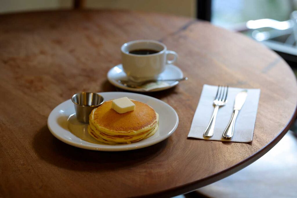 しっとりふわふわ、ほのかな酸味がアクセントのニューヨークスタイルのバターミルクパンケーキ1500円はカナダのゴールデンメープルシロップをお好みでかけて。オリジナルブレンドコーヒー700円はすっきりとした飲み心地