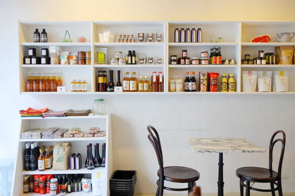店内のグローサリー棚には仁平さんが愛用&「京都らしさ」も意識してセレクトしているという食材や調味料が並ぶ。休日にブランチとワインを楽しんだ後、お買い物をして帰るのも楽しい。