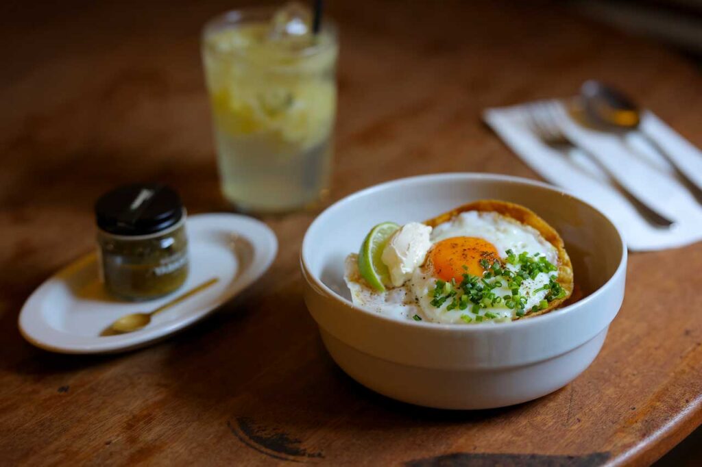 ウエボス・ランチェロス1700円は少しスパイシーな風味が後引く美味しさ。自家製レモネードソーダ900円は果肉たっぷり 注目は、仁平さんがニューヨーク在住中によく食べていたというウエボス・ランチェロス。揚げたトルティーヤをトマトソースや卵と一緒にザクザク混ぜて食べるメキシコの定番朝ごはんだ。