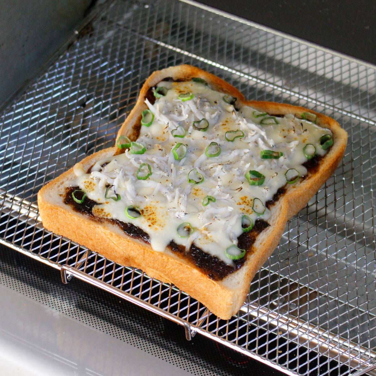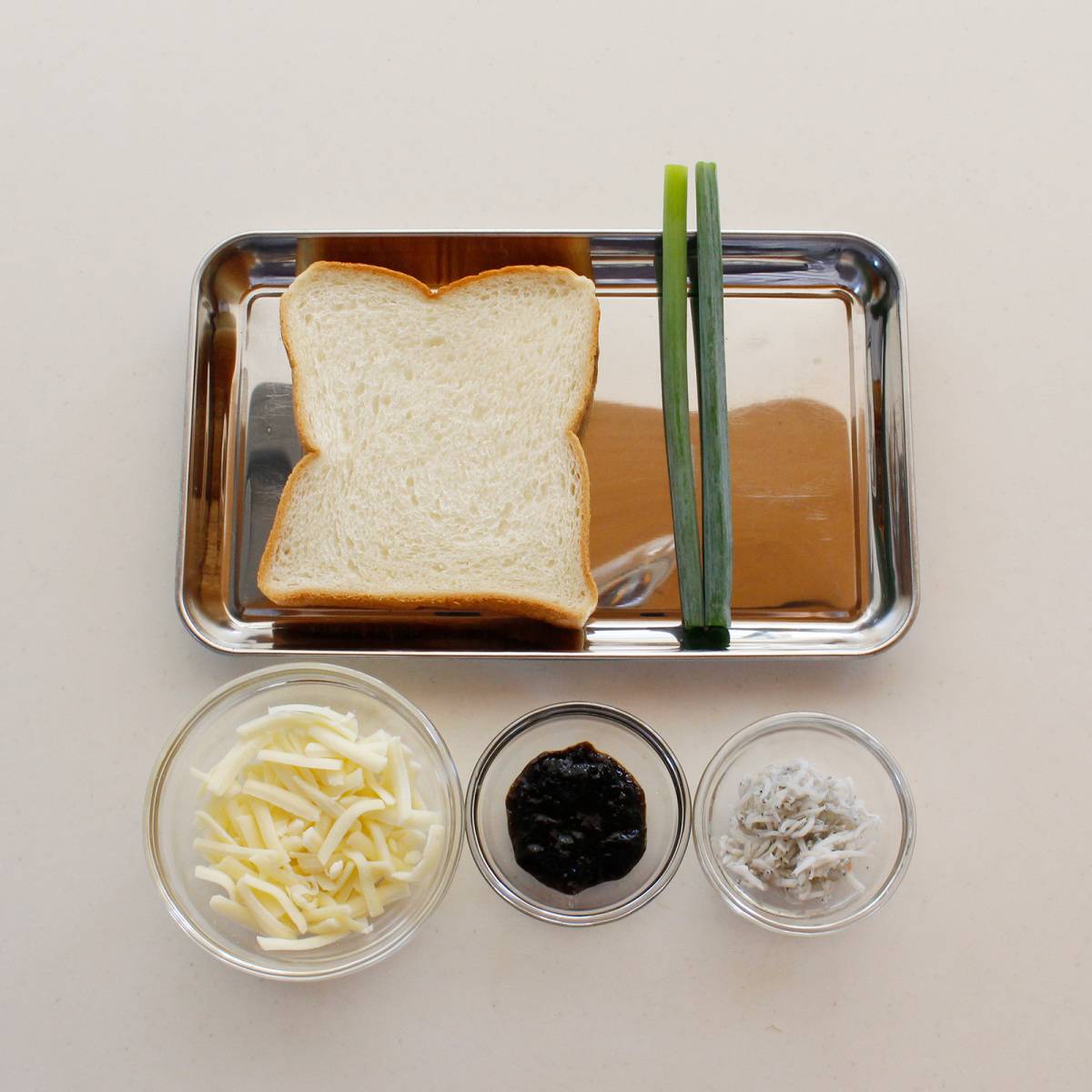 食パンに海苔佃煮を塗り広げ、ピザ用チーズ・しらす・青ねぎをのせます。