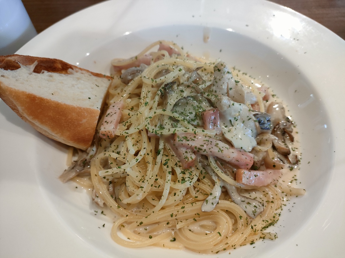 クリームベースのパスタに、愛別産の舞茸とベーコンがたっぷり!