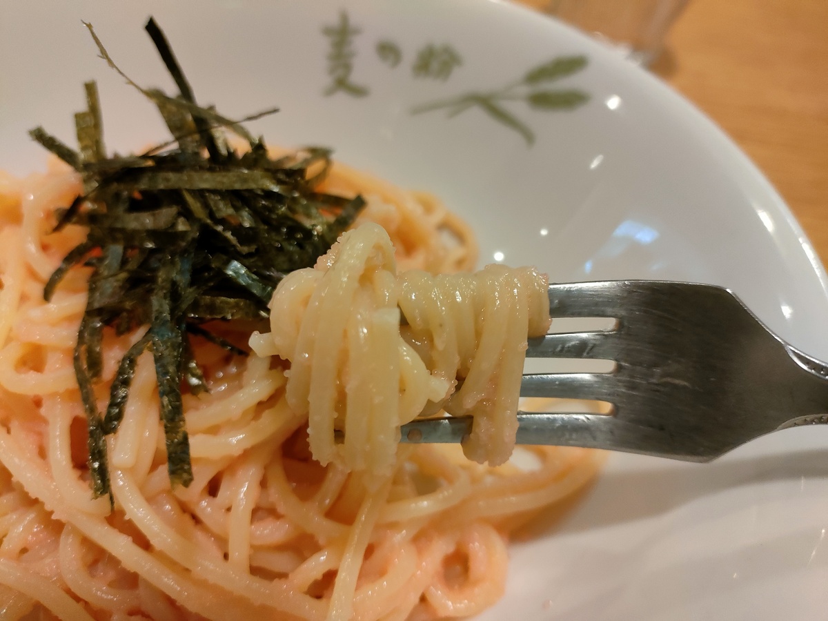 まろやかなクリームソースと明太子のピリッとした塩辛さがよく絡みます。