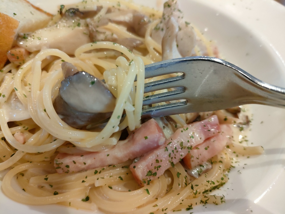 ニンニクが効いたクリームソースと旨味たっぷりの舞茸、そして香ばしいベーコンがとってもクセになります!