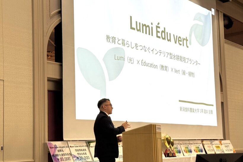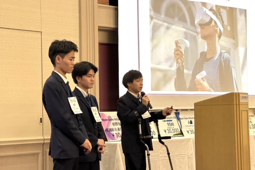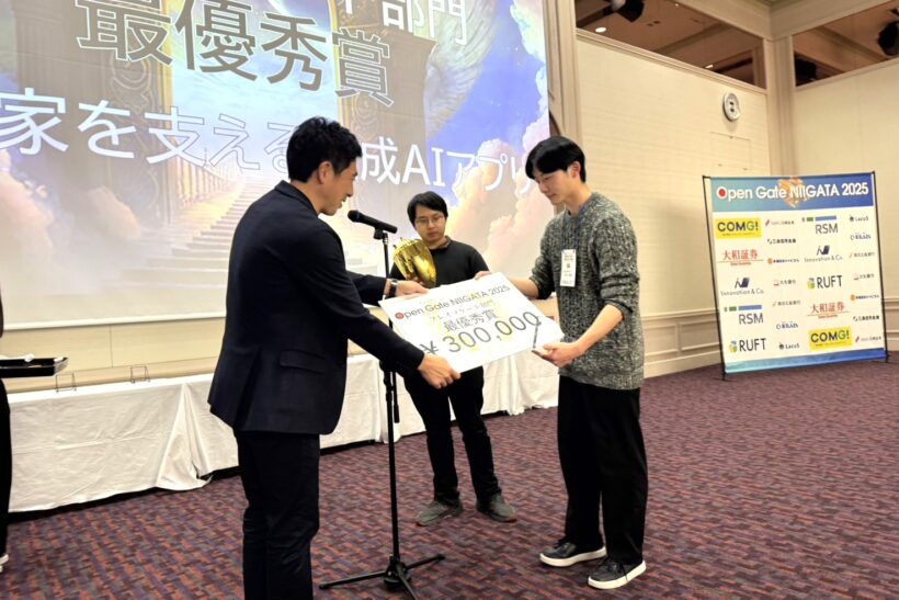 ブレイブゲート部門の最優秀賞は、長岡技術科学大学の「新規農家を支える生成AIアプリ」が受賞した。米作を中心とした農作業の手順や判断を、生成AIや大学の技術でサポートする仕組みで、農業初心者の参入を後押しする狙いがある。北川斐湧さんは「毎日のように2人で開発してきた努力が実った。他の発表もレベルが高く、受賞は意外だった」と話した。チームメートのチンパリーナンタポンさんは「新潟の農家の方々と一緒に、技術で課題を解決していきたい。来年には起業する予定だ」と意欲を示した。審査員からも「大人のピッチイベントでも上位に入るレベル」「社会課題への真っすぐな挑戦」と高く評価された。