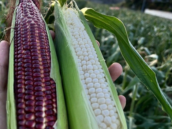 日本初の赤色とうもろこしと、甘~い白とうもろこしの狩りたてを、畑で2本味わえます(もぎ取りは1本330円で持ち帰りOK。)