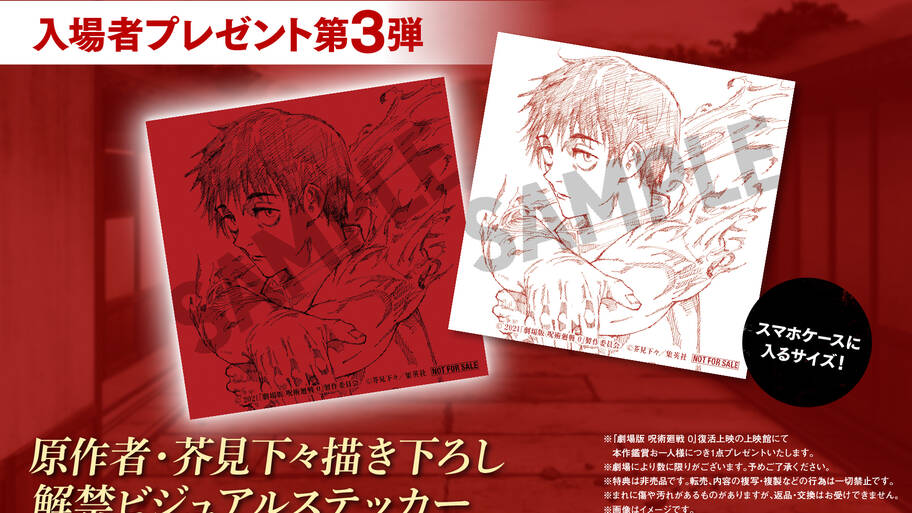 『劇場版 呪術廻戦 0』復活上映入場者プレゼント第3弾は、原作者・芥見下々描きおろし解禁ビジュアルステッカーに決定した。「劇場版 呪術廻戦 0」情報解禁時に公開された芥見下々先生描きおろし解禁ビジュアルを、色違い2種1セットのステッカーで配布する。