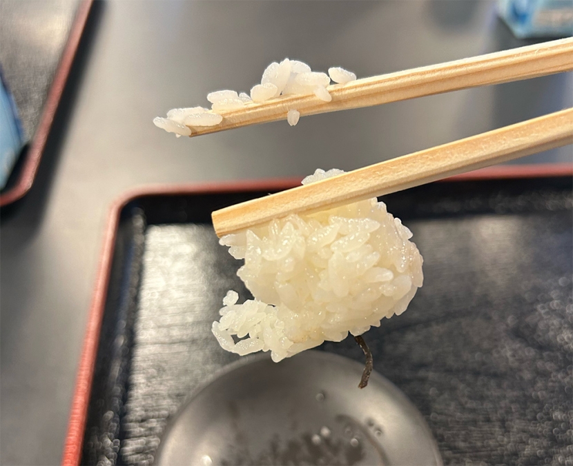 箸にくっついて取れなくなったおにぎり。粘りがありながら、口に入れるとパラッとほどける不思議な食感