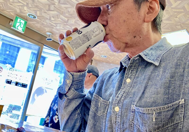 最近は立ち飲み形式の飲食店全般が「角打ち」と称されるが、本来は酒屋の店内で酒を飲むこと。そういう意味で、ここは本物の角打ちだ。日本酒・焼酎の瓶が並ぶ陳列棚やビールなどが入った冷蔵ショーケースに囲まれた店内で一杯やるのが、トラディッショナルなスタイル。まずは自分で冷蔵庫から缶ビールを1本取り出し、コップに注がずにそのままグビッと飲むのが気分だ。店内は早い時間から賑わっていて、それぞれが好きな酒を片手に談笑している。