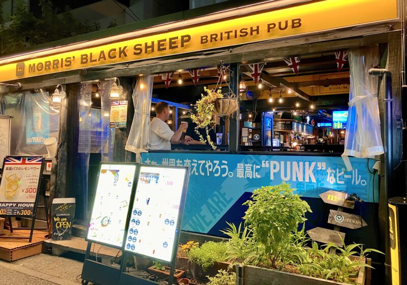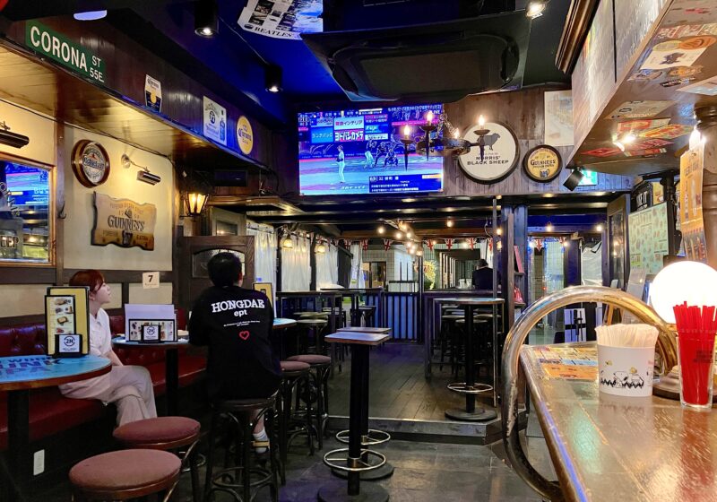 2軒目は、本格派のブリティッシュパブ「モーリス・ブラックシープ」へ。テラスを合わせると100席程の大バコだが、カウンター前の一角が立ち飲みスペースになっている。店内に設置された大型モニターで野球やサッカーの試合をライブで観戦しながら、スポーツバーとして利用することもできる。