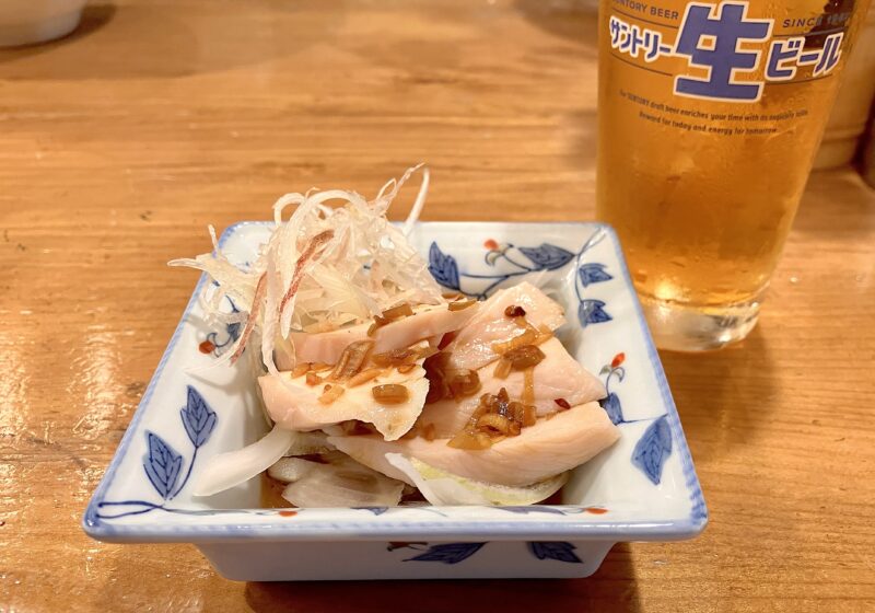 カウンターに着くと、まずは生ビールに「よだれ鶏」(480円)を注文。博多名物の「明太子のあぶり」(380円)や「ごまサバ」(700円)をはじめとする酒のつまみも充実していて、ドリンクメニューも豊富に揃っている。店内は今時の若い子から会社帰りのサラリーマンまで幅広い世代で賑わい、飲食激戦区の大名において人気を博している。