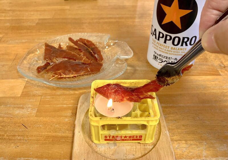 冷蔵庫のビールは定価+90円、焼酎は1杯300円〜、日本酒は400円〜で、全国の銘酒が揃っている。壁に貼られたおつまみメニューも1品150円〜とまさに庶民的な価格で飲むことができ、角打ちはこうでなくっちゃ。炙った「鮭とば」と「魚肉ソーセージ」をつまみにビールとワインを飲めば、あっという間にご機嫌になれる。