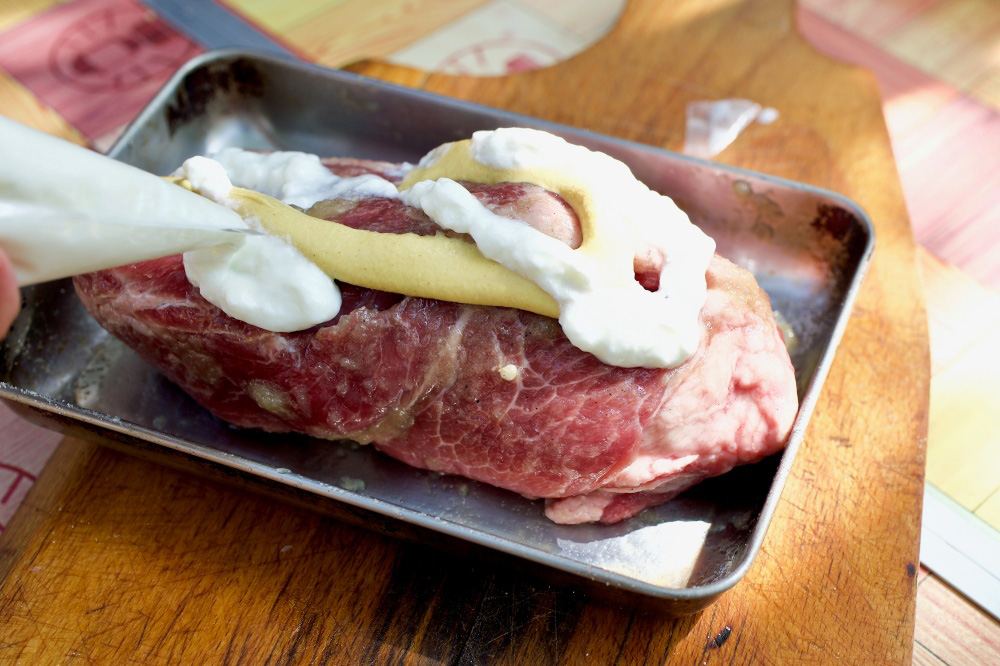 常温に戻した肉の表面にニンニク、ヨーグルト、ディジョンマスタードをまんべんなく塗る。【POINT】液状の調味料はクリームの絞り袋に入れて使うと手が汚れにくい。