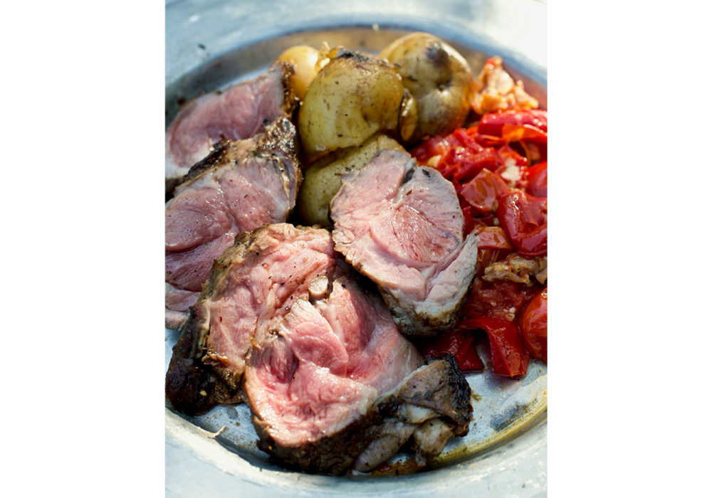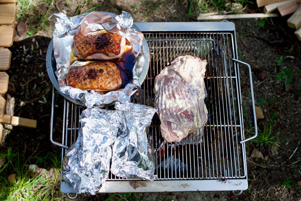 仔羊のローストは店でも出しているが、前日に塩だけ揉み込み、焼く前にマリネするだけでアウトドアでも楽しめる。火の通り具合に合わせて火力の強い場所と弱い場所を移動させるのがポイントだ。肉だけはネットショップなどで上質なものを選ぶとなおよい。