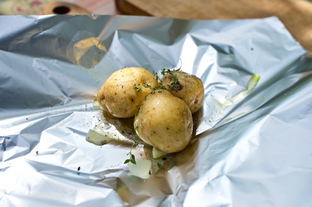 ジャガイモを洗い、塩を振る。ニンニク、タイムを加え、E.V.オリーブ油を回しかけてアルミホイルで包む。