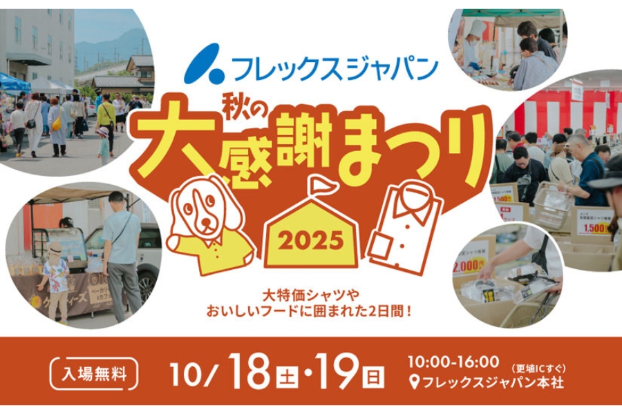 2025年10月18日(土)、10月19日(日)に、長野県千曲市の「フレックスジャパン本社」にて『フレックスジャパン秋の大感謝まつり2025』が開催。同イベントは、着心地にこだわったワイシャツなど、シャツ専業メーカーとして知られている株式会社フレックスジャパンが主催。倉庫開放による大特価セールをはじめ、地元飲食店・クラフト作家によるマルシェやライブ演奏などが楽しめます。