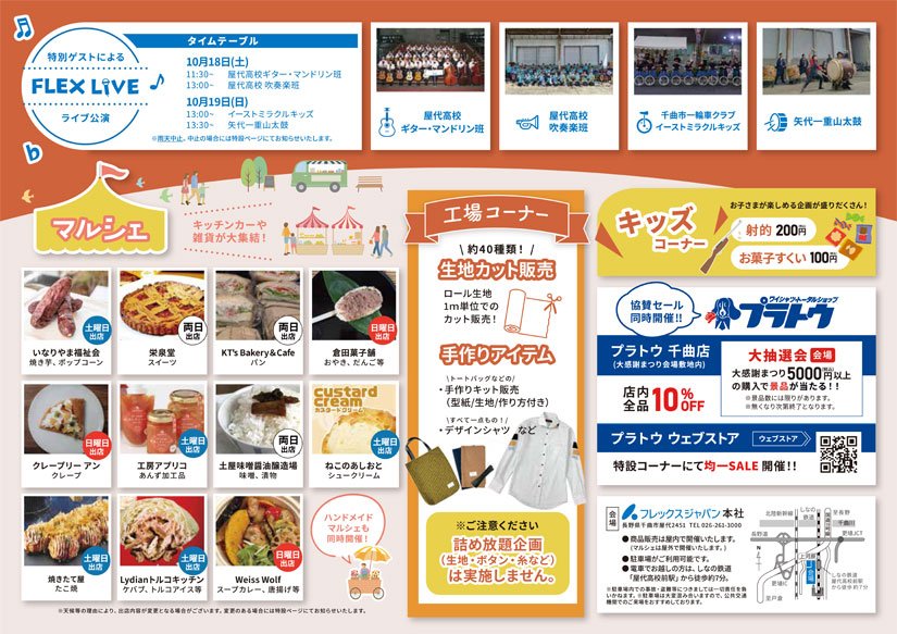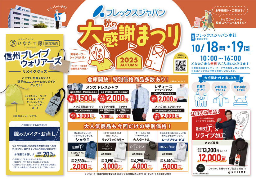 10/18(土)10/19(日)『フレックスジャパン秋の大感謝まつり2025』倉庫開放の大特価&最大62%OFF!地元グルメとハンドメイドマルシェも@長野県千曲市