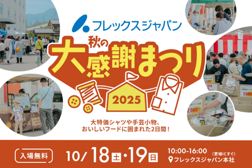 2025年10月18日(金)、10月19日(土)に、長野県千曲市の「フレックスジャパン本社」にて『フレックスジャパン秋の大感謝まつり2025』が開催。同イベントは、着心地にこだわったワイシャツなど、シャツ専業メーカーとして知られている株式会社フレックスジャパンが主催。倉庫開放による大特価セールをはじめ、地元飲食店・クラフト作家によるマルシェやライブ演奏などが楽しめます。