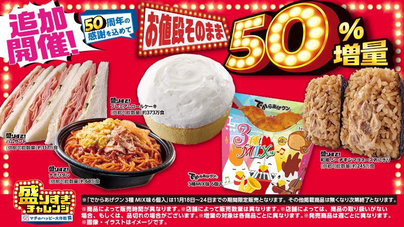ローソンは、値段そのまま50%増量する「盛りすぎチャレンジ」を2025年11月18日から開催しています。