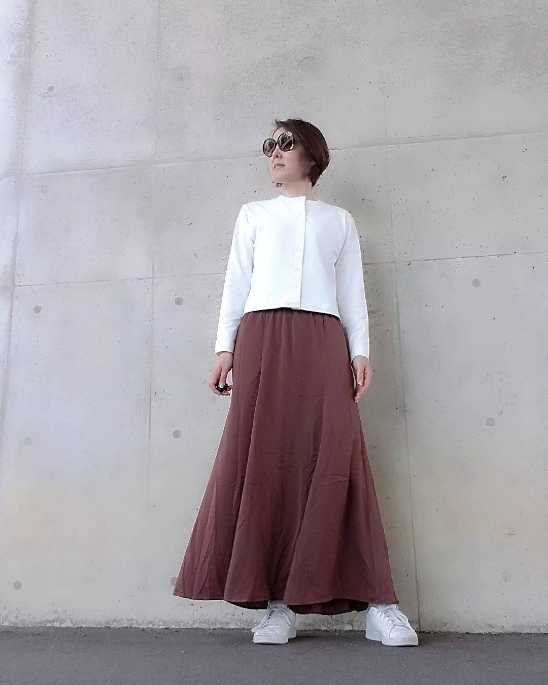 ボトムスにブラウンのスカートを合わせれば、大人っぽく上品な印象に見えるので、50代の女性によく似合いますよ♡