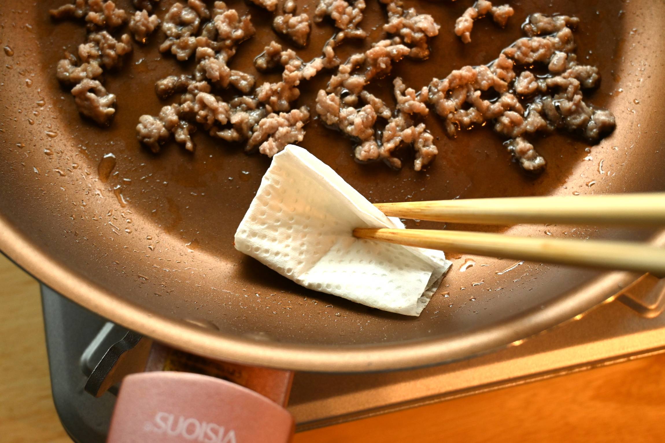 油をひいていないフライパンにひき肉を入れて炒めます。出てくる余分な脂はキッチンペーパーでふき取ります。