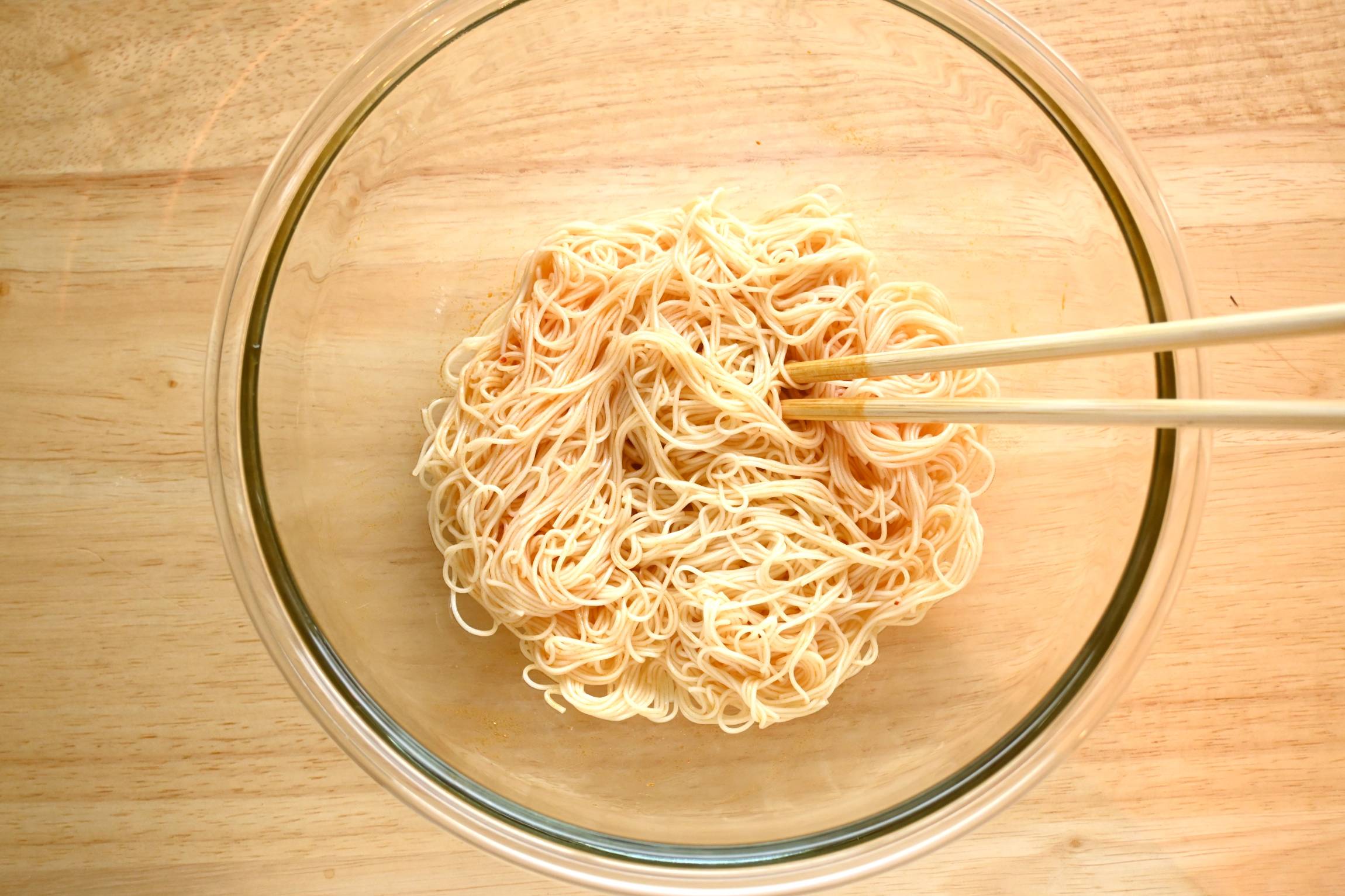 そうめんをボウルに入れ、残りのラー油とめんつゆを加えて和えます。
