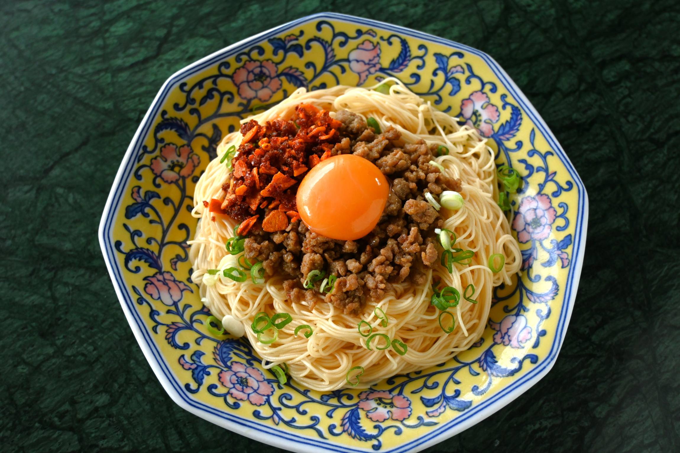 そうめんを器に盛り付け、肉味噌をのせて小口ねぎを散らします。卵黄、食べるラー油の具材をのせれば完成です。