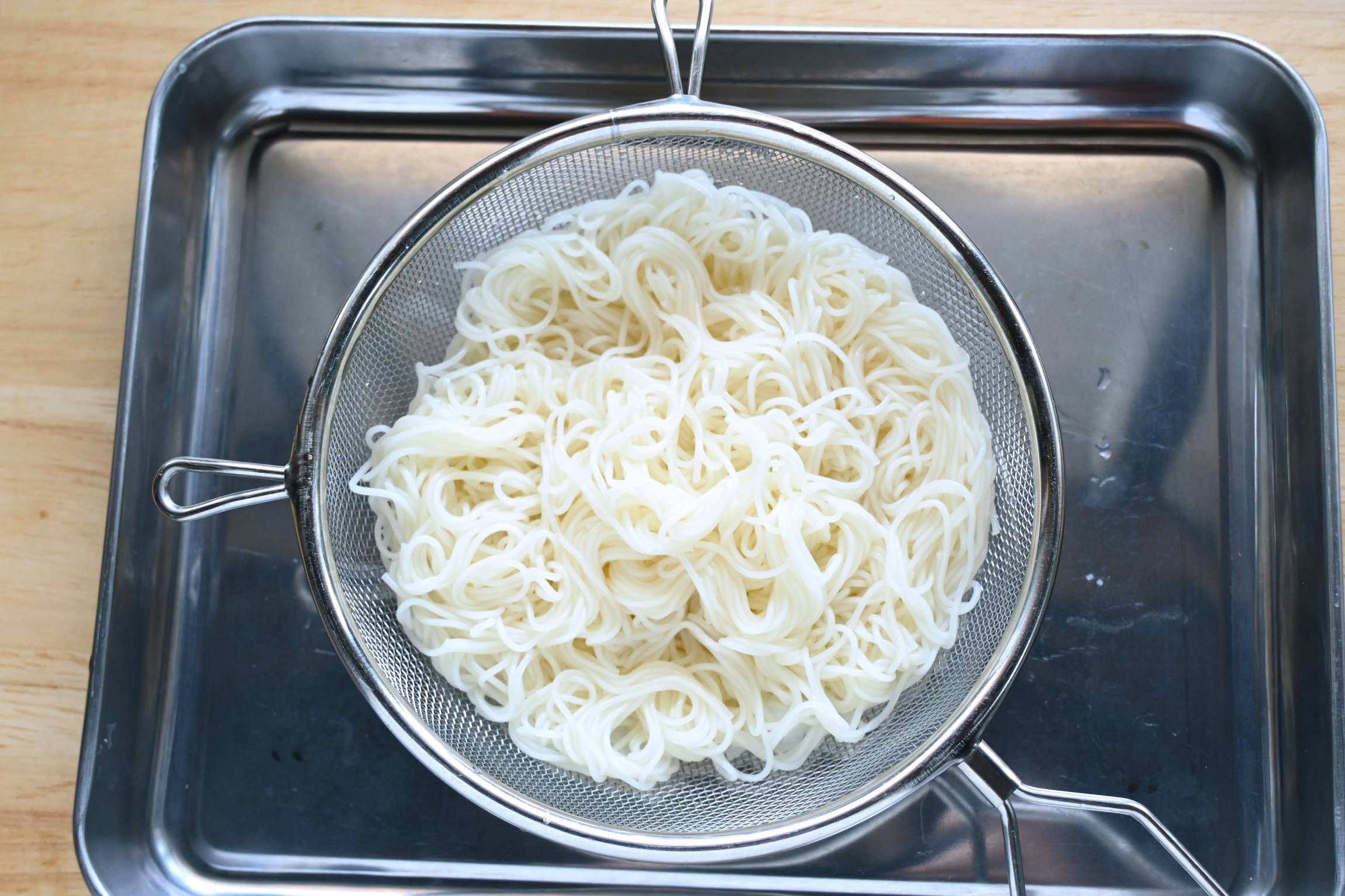 そうめんをゆでて流水で洗ってぬめりを取り、ザルにあげて水気をしっかりと切ります。