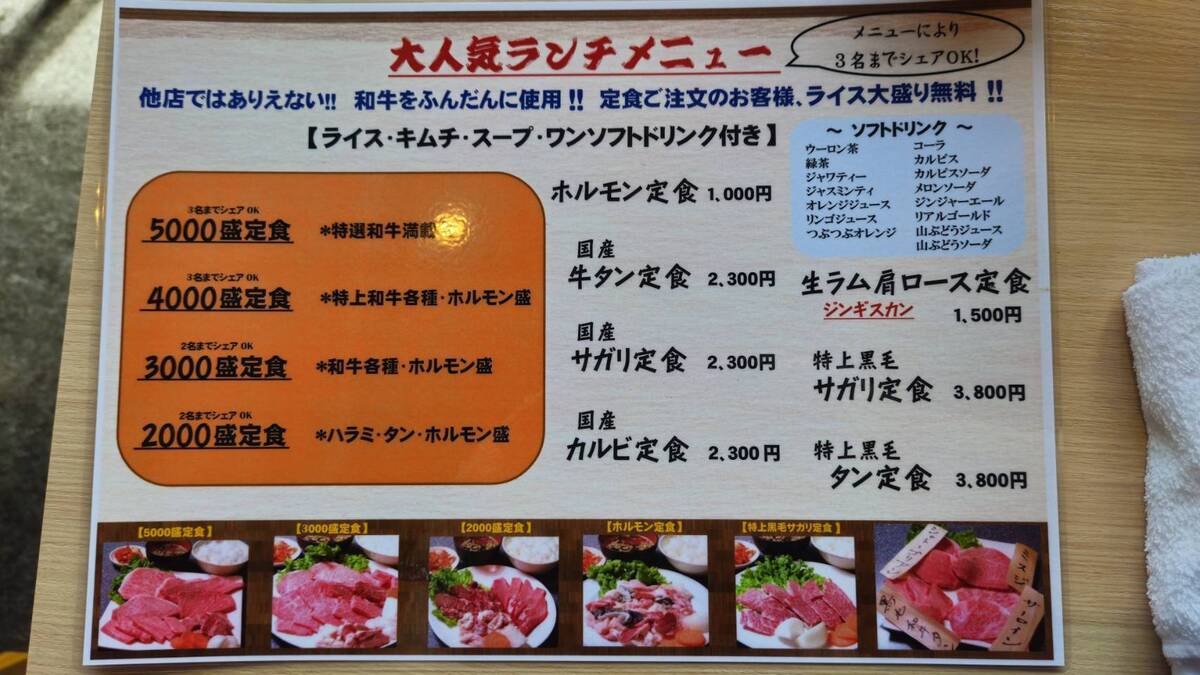 金額で内容が変わるメニューや各種部位のメニューがあります。