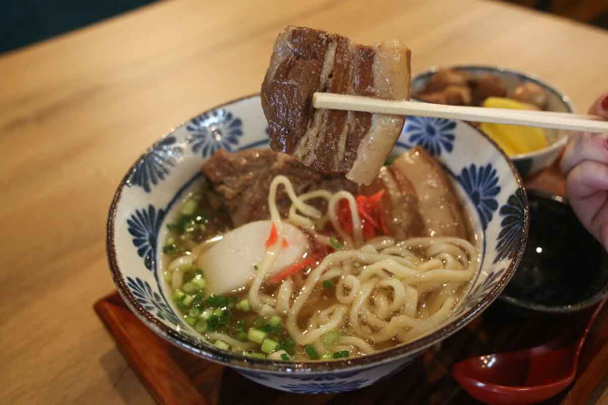 ミックスそばには三枚肉とソーキ、かまぼこがのっており、すごいボリュームです。