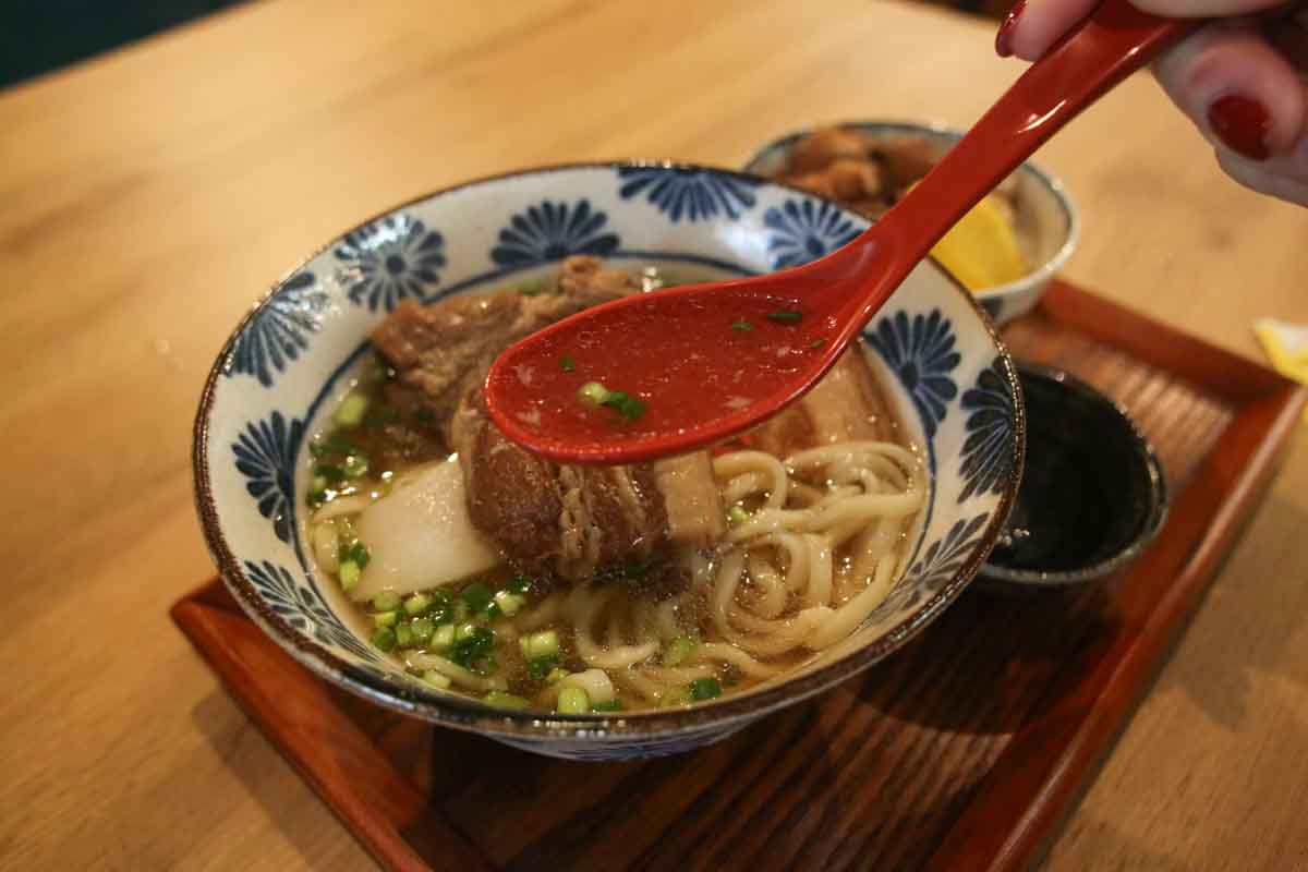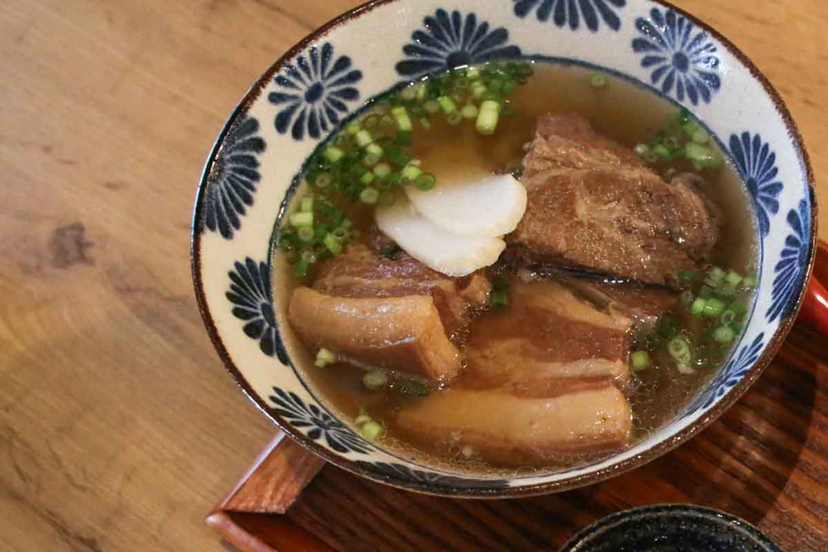 スープは鰹ベースで、あっさりした味わいですが、コクもあるので満足感があります。 お肉から溶け出した脂がスープに加わり、ほんのり甘さが出ているのも良いですね。 スープがやさしいからか、コーレーグースを入れるとパンチのある味になります。 いつもより少ないかな?くらいの量にすると、バランスの良い味になりますよ。