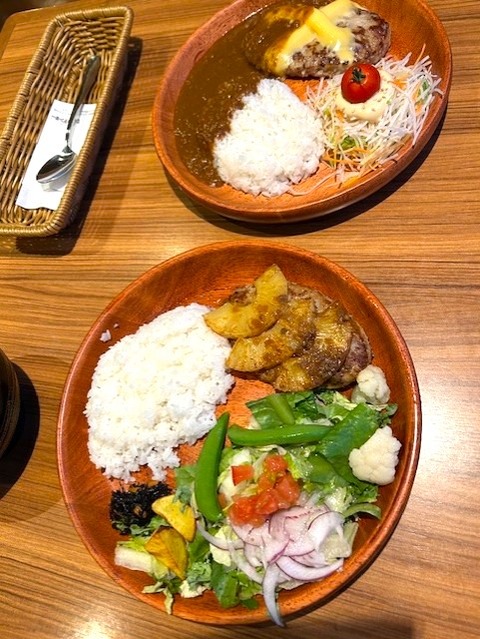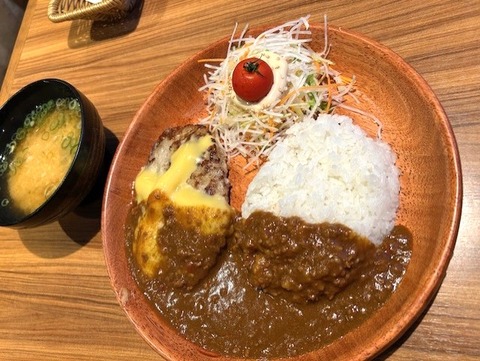 じっくり煮込んであるカレーは大人も楽しめる味、チーズハンバーグとカレーの組合せは、満足なプレートです。※お子さまカレーは別にあります。