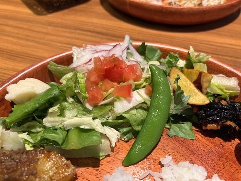 サラダは、スナップエンドウ、レタス、キャベツカリフラワー、トマトと品数も多くドレッシングも爽やか系でした。ひじき煮とサツマイモも付け合せてあり、ボリュームありました。