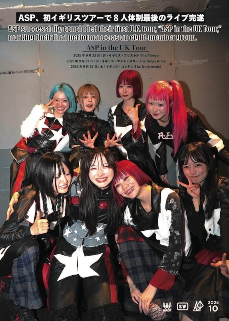 ASPがキャリア初の海外ツアーとして挑んだイギリス3都市を巡る<ASP in the UK Tour>の模様を特集する今号。ツアーを経てさらに進化したASPは、国内全国ツアー<ASP CRUSH Tour 2025>を始動している。10月4日の愛知公演を皮切りに、大阪(11月22日)、横浜(12月14日)での公演が控えており、各会場のチケットも販売中だ。