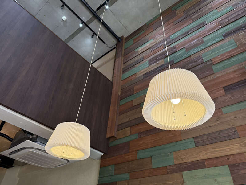 壁面の一部はウッドのプレートをモザイク状に組み合わせた装飾になっており、高い天井からはスタイリッシュなライトが吊り下げられています。