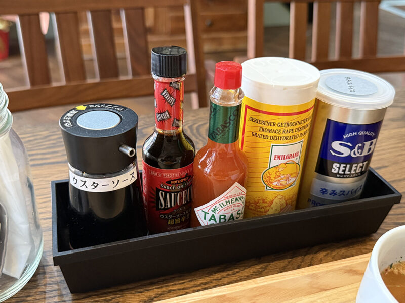 ナポリタンには粉チーズやウスターソース、タバスコなどの調味料が付いてくるので、好みの味に調整することもできますよ。