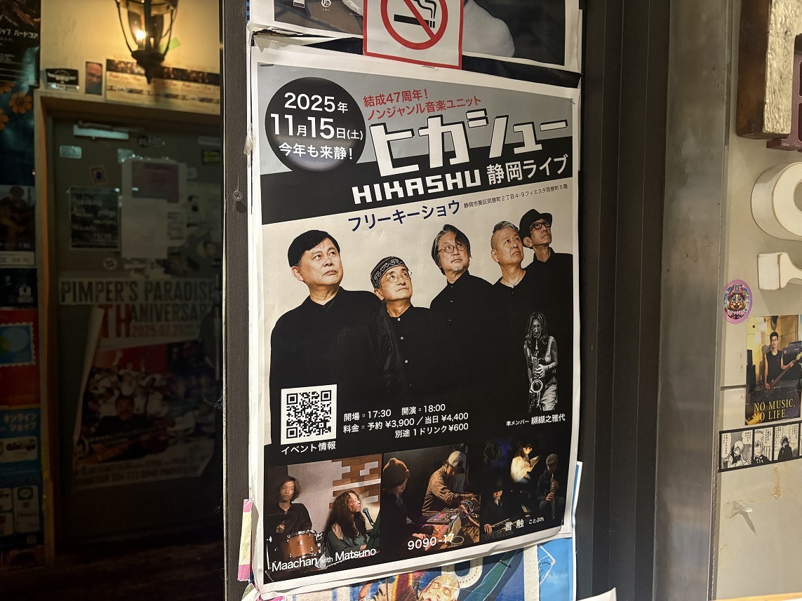 毎年恒例となった静岡市内でのヒカシューのライブ。12日の大阪から始まった東海道ツアーの最終日の演奏は、ロック的ダイナミズムに満ち満ちていた。この会場でヒカシューを見るのは3回目だが、これまでで最も力感があった。
