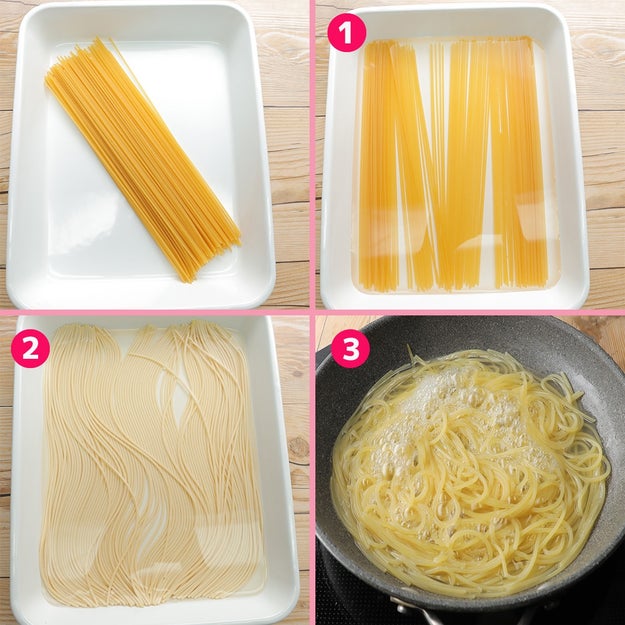 ① バットに水(分量外、500ml)を入れ、スパゲッティを広げる。