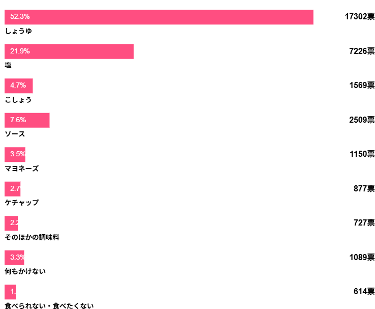 しょうゆ:52.3% 塩:21.9% ソース:7.6% こしょう:4.7% マヨネーズ:3.5% 何もかけない:3.3% ケチャップ:2.7% そのほかの調味料:2.2% 食べられない・食べたくない:1.9%
