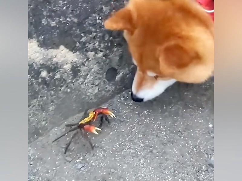 ある日、柴犬の男の子「スティーブ」さんとコーギーの女の子「ハル」さんは、お散歩中に小さなカニさんと遭遇したそうです。
