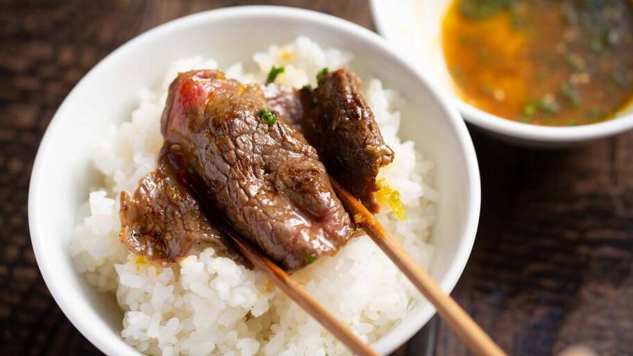どんぶりはコンパクトですが、肉厚のローストビーフがたっぷりとご飯を覆うようにのっています。