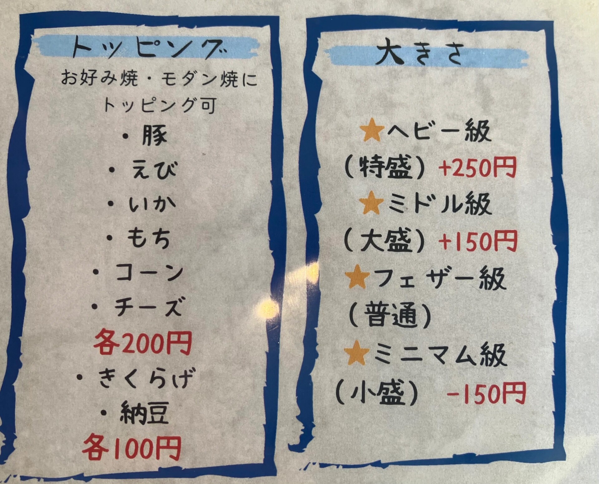 同店は、お好み焼きや焼きそば、とんぺい焼きなどの基本メニューを押さえつつ、ホルモン焼きもライナップ。焼き飯や丼などのご飯メニューがあるのも嬉しいです。