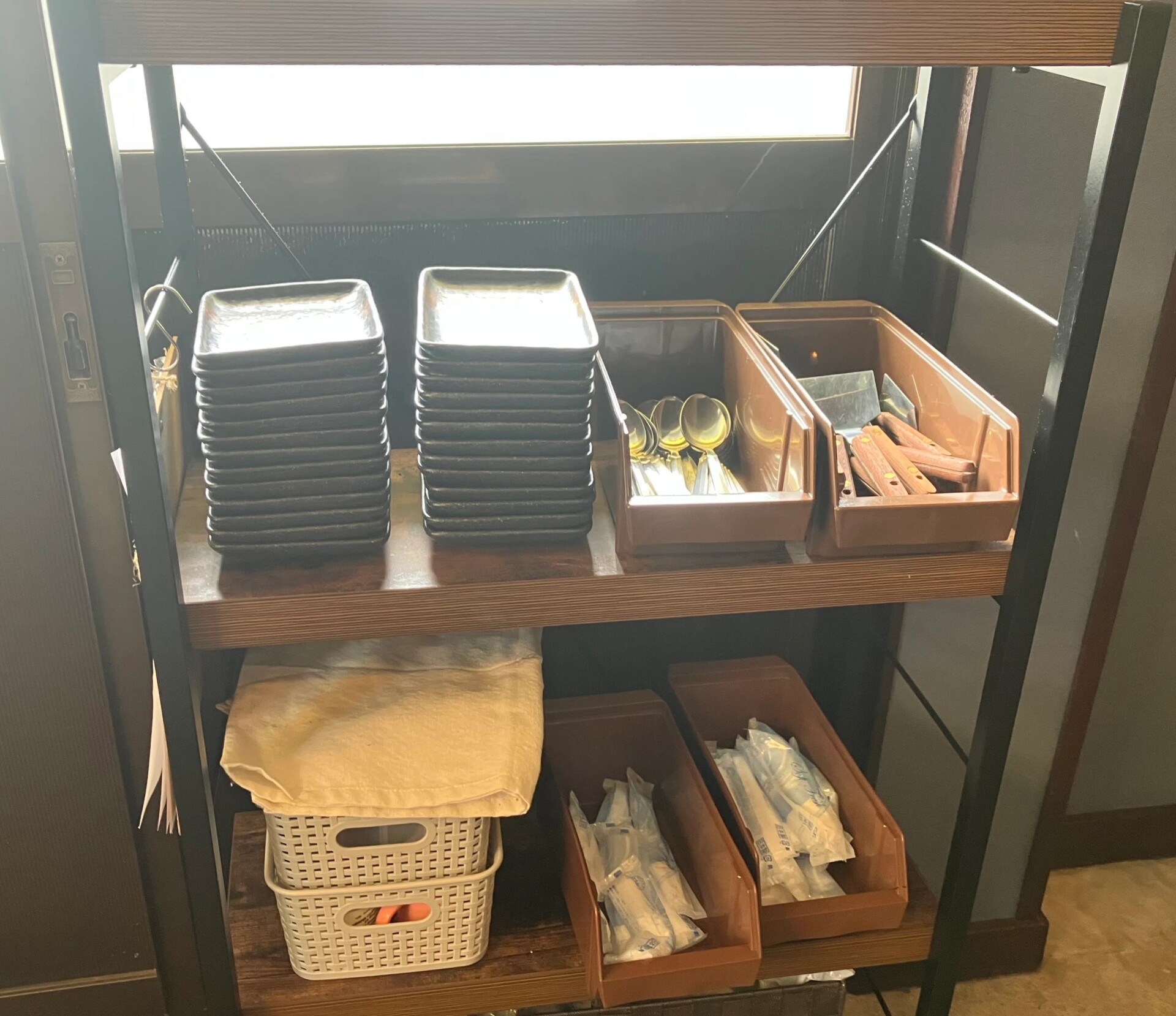 カウンター席と2つのテーブル席の間には、お冷、おしぼり、取り皿、コテなどが自由に取れるコーナーを設置。これはよいシステムだと思いました。