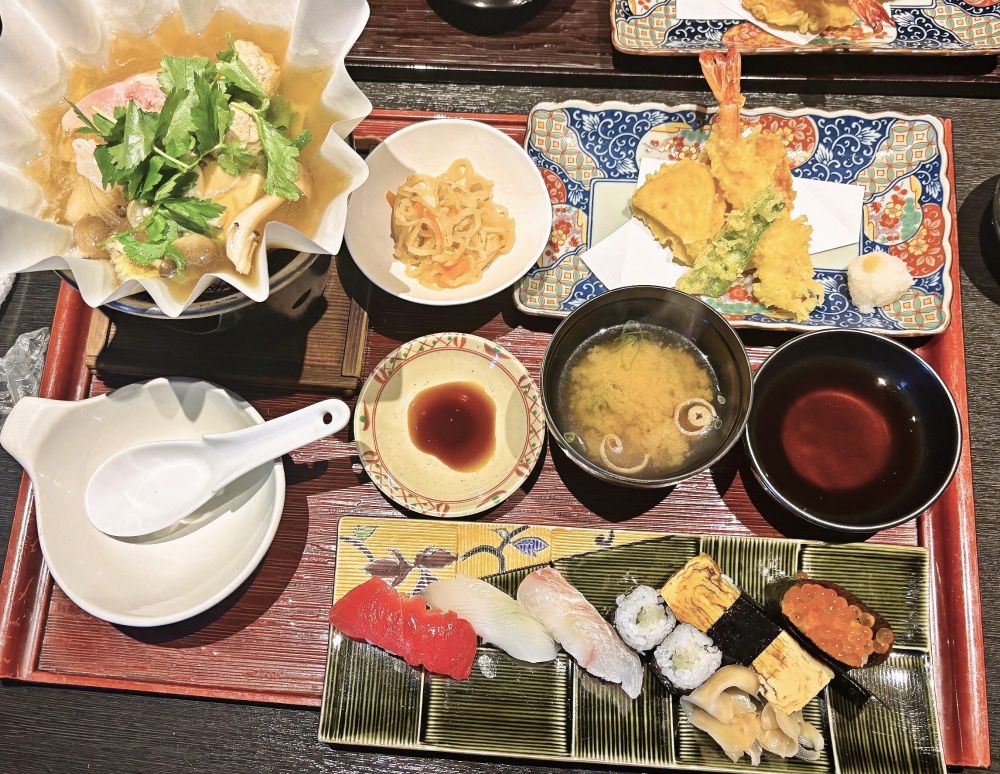 すし盛り合わせに小鍋や天ぷらが付いた豪華なランチ「寿司御膳」。握りの盛り合わせに小鍋、天ぷら、小鉢、汁物まで楽しめる、まさに王道の御膳です。プラス700円でドリンク・デザート付きに。