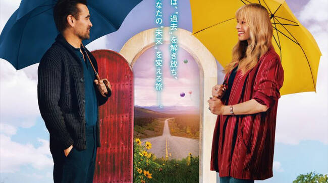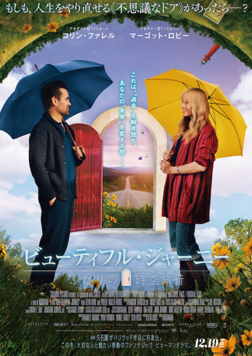 幻想的でいて爽やかな配色が印象的なポスターは、晴天にも関わらずカラフルな傘を差すふたりの間に、本作の象徴である<過去に戻れるドア>が出現。周りにはドアや灯台、花々が魚眼レンズで覗いたかのごとく円形に連なるなど、ファンタジー味溢れるデザインがこれから始まる輝かしい“時空の旅“を象徴している。