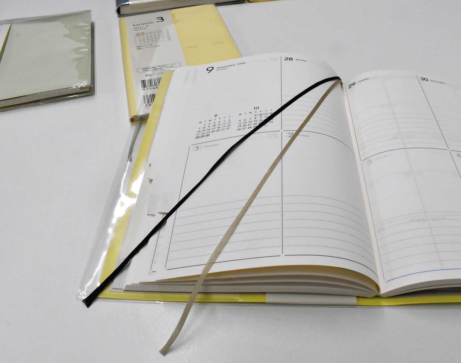 「1日に何度も引っ張っても取れないように、背の部分にのりで接着した上からシールを貼り付けて強度を高めています。このスピンそのものもオリジナルで、ほつれません。色はウィークリーには2本あって、2本のうち1本は全てグレーなんですけど、もう1本はカバーの色によって変えています。気づいてもらいにくいところですけどね(笑)。」