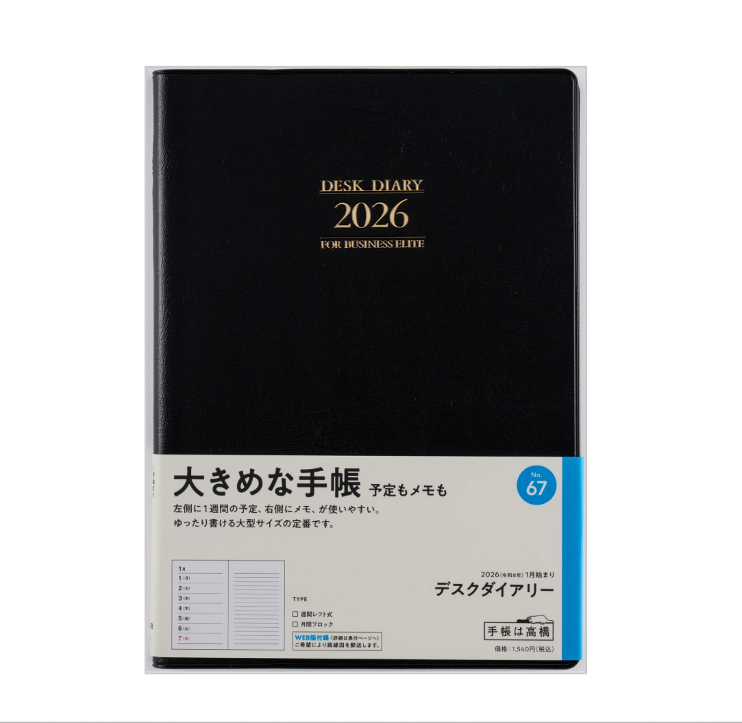 カバー画像のカラフルでキュートなtorincoシリーズとは対極にあるような真っ黒で大き目のこのビジネス手帳[No.67]デスクダイアリーが、「手帳は高橋」の人気ナンバーワンなのだとか。