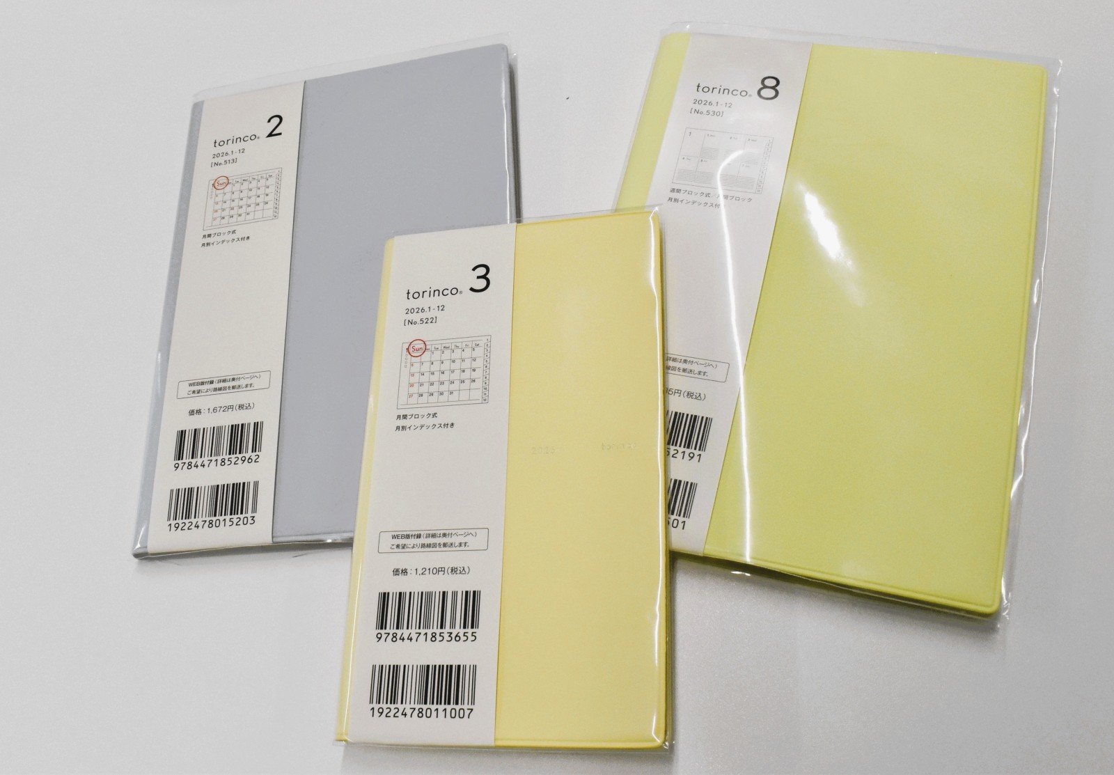 「torinco2は、マンスリーとメモのみのシンプルな手帳。B6サイズなので1日のブロックが大き目です。torinco3は2をコンパクトにしたタイプで、持ち歩きやすいサイズですね。torinco8はウィークリーでブロックタイプ。スマホと併用する方に人気で、タスク管理やライフログにぴったりです。」