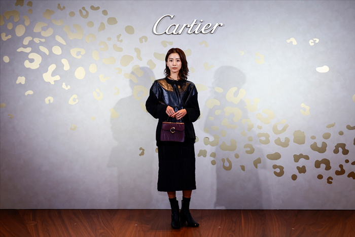 黒島結菜、光沢あるブラックのトップスにインパクトある「パンテール」のネックレスを合わせ、「パンテール」のボルドーのバッグを身に付けて登場!カルティエ 銀座4丁目ブティックがオープン