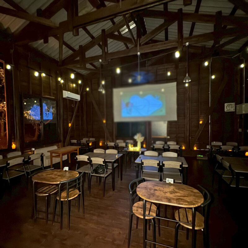 離れに入ると大きなスクリーンとキャンドルがお出迎え。映画を観ながらコーヒーを楽しむことができます。